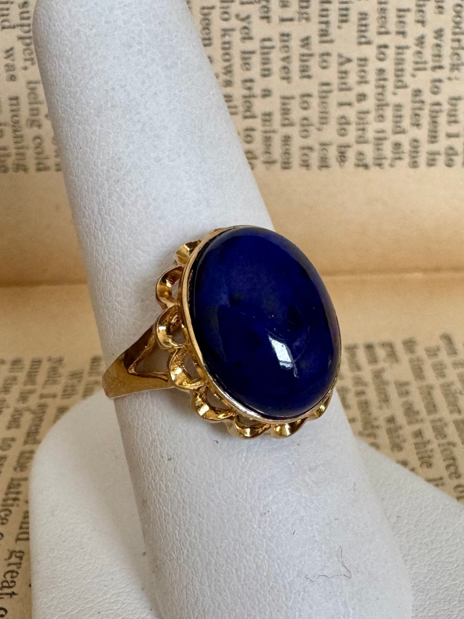 Gorgeous deep blue lapis lazuli mounted in 14k yellow gold with a scalloped filigree setting.