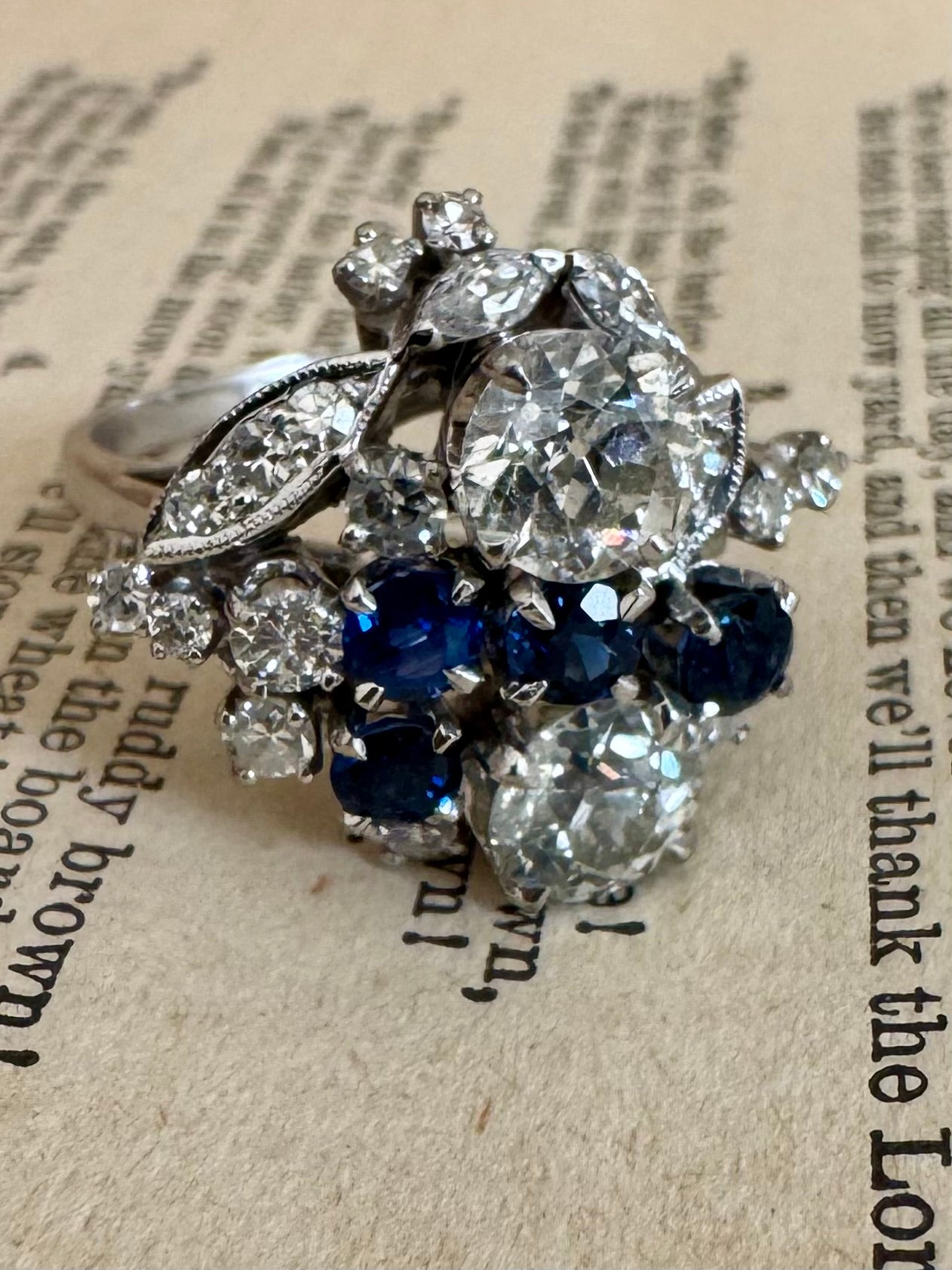 This mesmerizing cluster ring features an array of diamond brilliants set in 14K white gold with millegrain details and four beautiful accent sapphires.